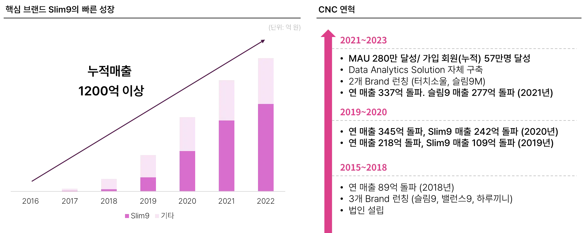 CNC는 외부 투자 없이 Slim9를 주축으로 6년간 연평균 성장률202%, 연매출 약 345억을 달성하였습니다.